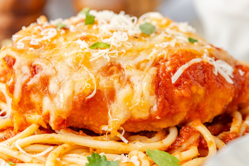 Spaghetti noodles are traditionally used in Chicken Parmesan recipes. But you can also use short pasta like rigatoni or penne pasta as well.