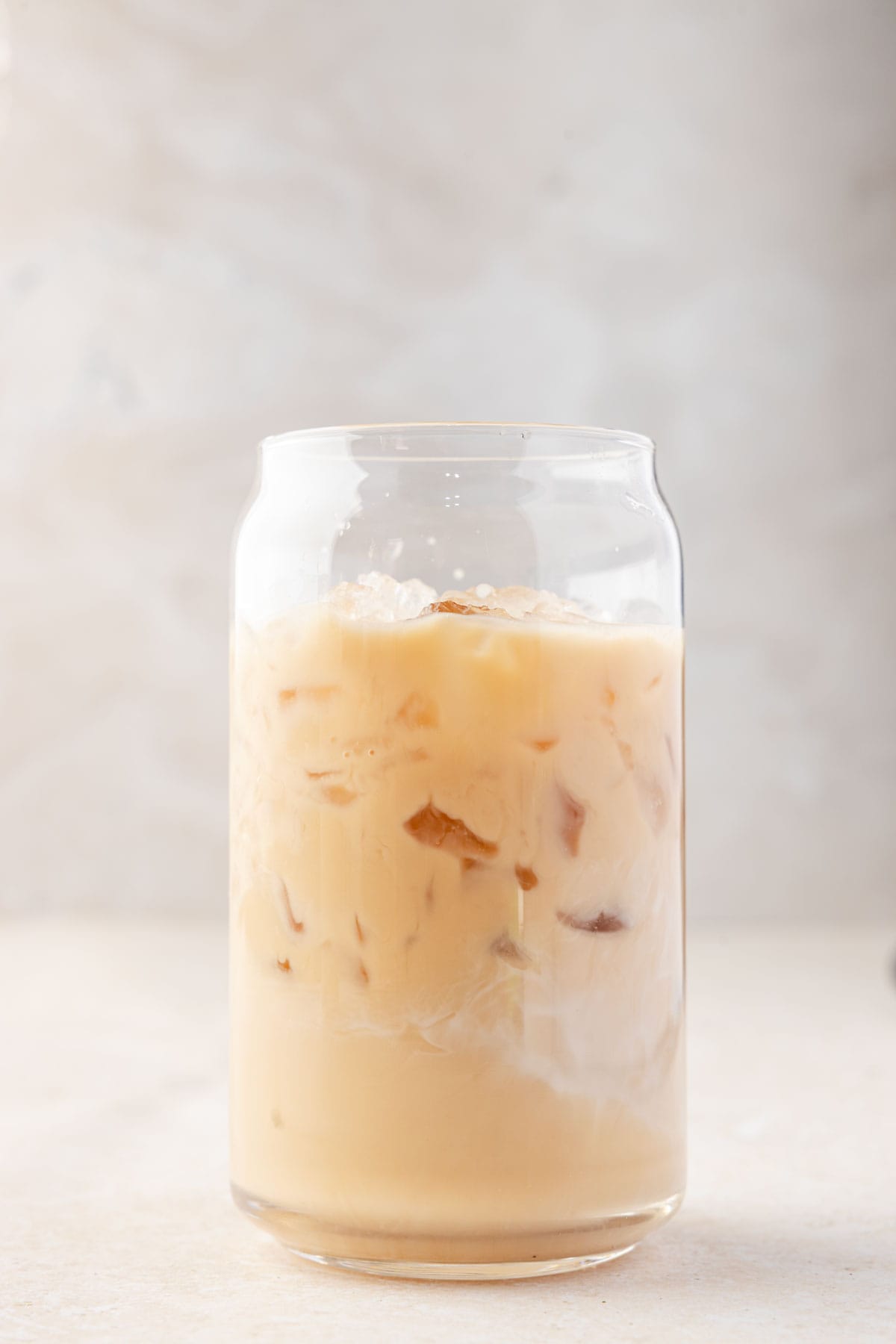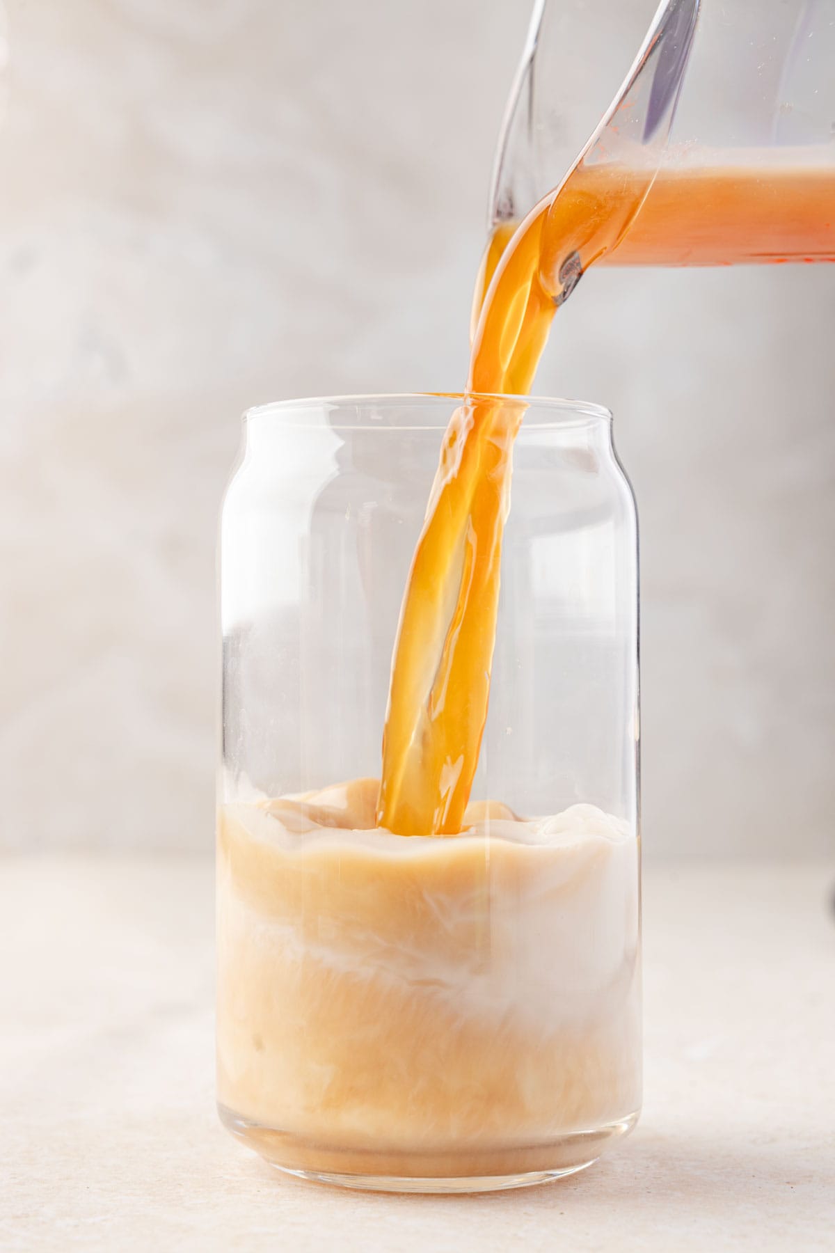 Add your oat milk and chai tea concentrate to a cup. Fill the cup with ice, leaving about half an inch from the top.