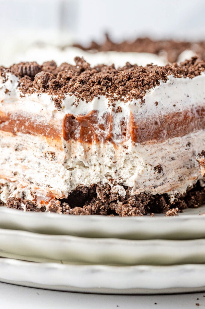 - Spread Cool Whip over the top of the chocolate layer, then sprinkle with crushed Oreo pieces. Refrigerate for at least 30 minutes before serving.