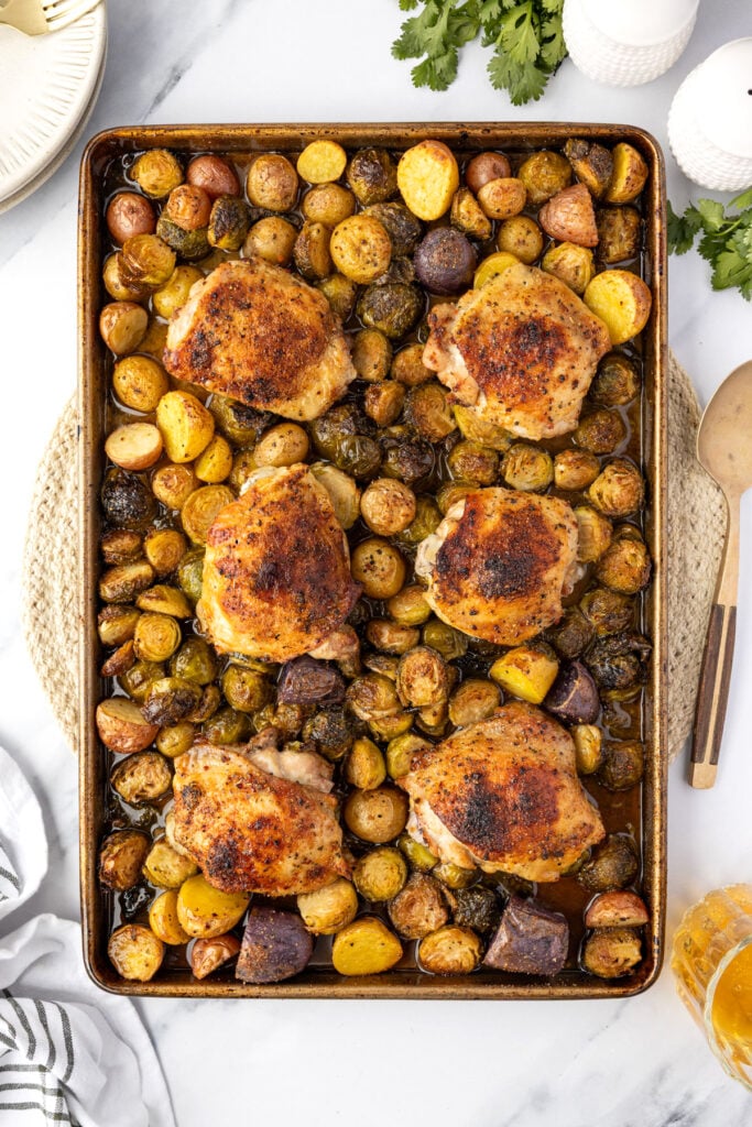 Weeknights around here are busy, and dinner needs to be something the kids will actually eat without feeling heavy before sports practice. When pasta starts feeling like the default, this sheet pan chicken thighs recipe is one I reach for instead. It is made with just six simple ingredients, comes together with minimal prep, and cooks all on one pan in the oven. The chicken stays juicy while the Brussels sprouts and potatoes roast together underneath, soaking up all that flavor, and somehow it still feels like I pulled off a real dinner without overthinking it.