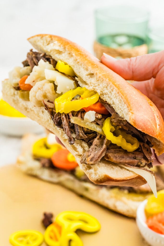 - Remove the roast and shred it using two forks. Return the shredded beef to the slow cooker and stir it into the juices. Let it soak for at least 15 to 20 minutes to absorb maximum flavor. To assemble, split the hoagie rolls and toast lightly if desired. Place a slice of provolone cheese on the bottom of each roll. Pile the shredded beef onto each roll, spooning extra juices over the top. Finish each sandwich with a generous spoonful of giardiniera for a bright, tangy crunch. Serve with extra au jus for dipping, if desired.