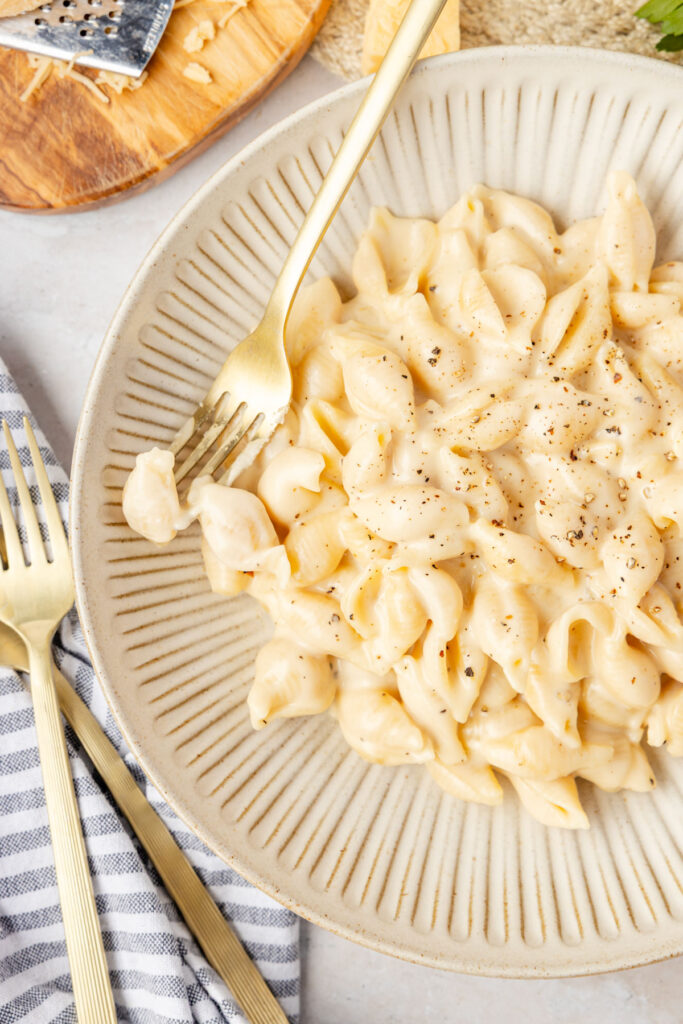 Stir the cooked pasta into the cheese sauce, then slowly add the pasta water until you reach your desired consistency.