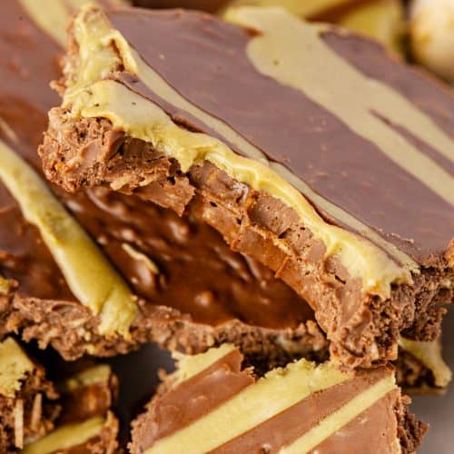 Transfer the remaining pistachio butter to a Ziploc bag, cut off the tip of one corner, and drizzle the nut butter over the chocolate. Gently tap the sheet pan on the counter to help the layers blend. Refrigerate for at least 1 hour, or until the chocolate has set.