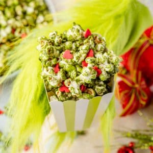 Grinch Popcorn is the ultimate salty-sweet holiday snack. Green kettle corn, covered in candy hearts, makes this easy recipe perfect for Christmas movie nights or Grinch-themed parties.